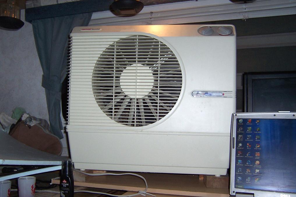 Now I've made swamp coolers before, but they were tiny as seen in earlier pictures of the dungeon. In reality it probably pulled near as many watts as the one above (mainly because of the pump used) and came no where close to putting out the volume of air or cooling near as good either. I'd say having one of the Convair Westwind swamp coolers is the only way to go. I won't be trying to make any other swamp coolers because they just can't measure up! Fortunately I didn't have to buy that one, but if you plan to spend a fortune on the stuff to build one that won't work near as good then why not buy one of those instead. The pump is actually run off of the fan motor via a small belt so no need for a pump motor. You can also regulate the amount of water to the pad by a dial on the front of the unit so you can pick the cool level you want and water savings along with it. It also has a turbine type blade which cuts down on the problem with wind coming in a window from the other direction. It can also be used outside for spot cooling.